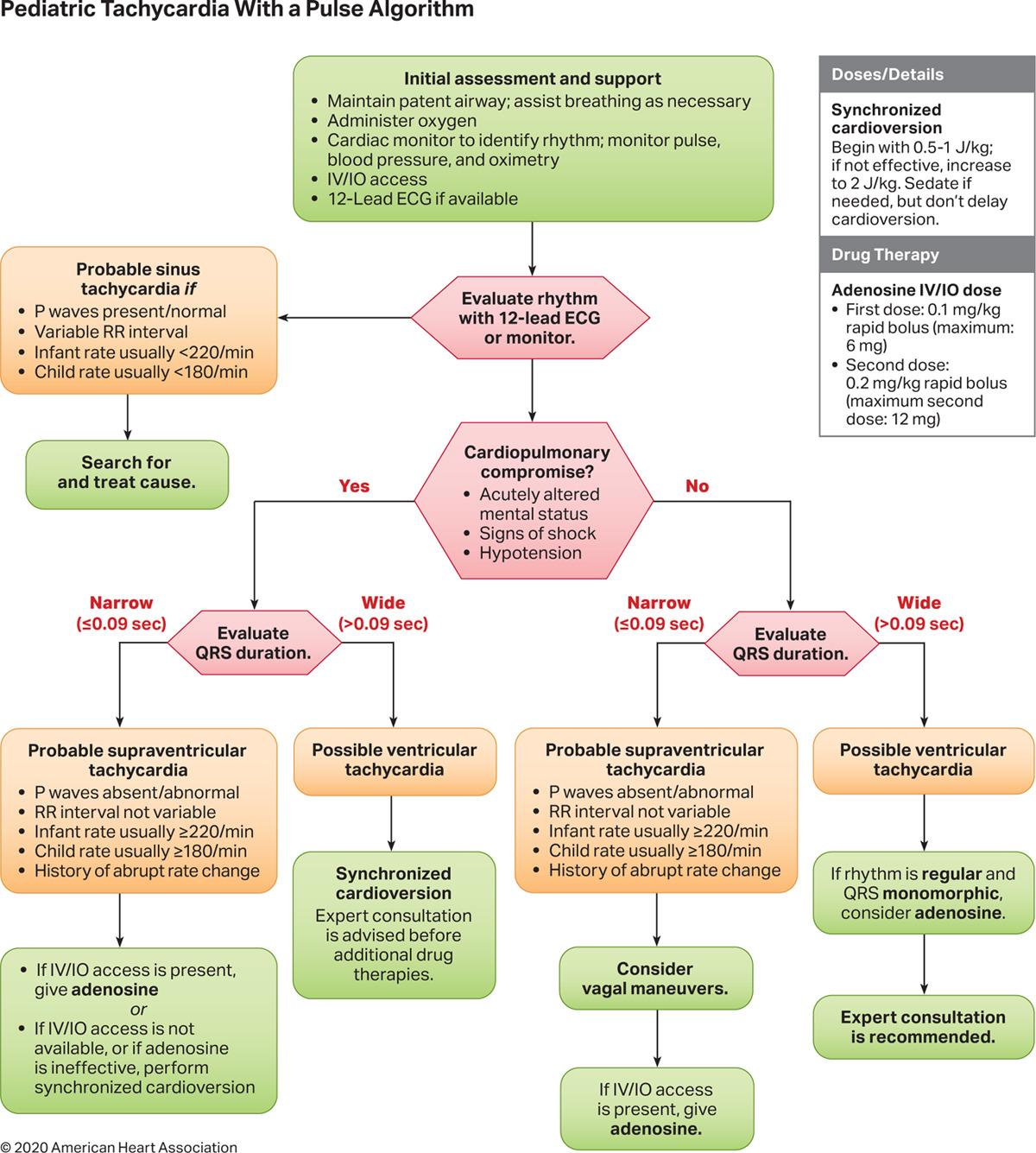 정맥 투여가 가능할 경우 아데노신 0.1mg/kg (최대 6mg) 투여 가능, 첫 투여 후 2분 이내 반응이 없다면 0.2mg/kg 투여해 볼 수 있음